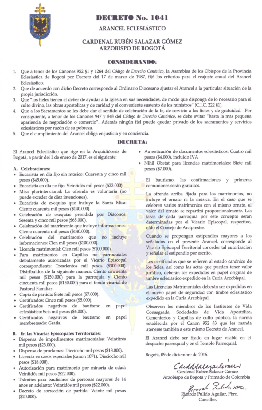 Centro de información Yo quiero Noticias Oraciones Boletines Eventos Artículos Canonización Mensajes del Señor Cardenal Cartas pastorales Homilías Mensajes La voz del pastor Documentos del Vaticano BoletinesArancel Eclesiástico 15 de Diciembre de 2016 El señor cardenal Rubén Salazar Gómez ha expedido el decreto anual del Arancel eclesiástico Like 0 Dislike 0 Últimos boletines Nombramientos en la Arquidiócesis de Bogotá20 de Noviembre de 2025La cancillería arquidiocesana comunica los siguientes nombramientos: La señora María Rivera descansa en la Casa del Padre 12 de Noviembre de 2025Elevamos plegarias al Señor de la vida como Iglesia arquidiocesana por la señora María y oramos para que el Padre la acoja en su Reino