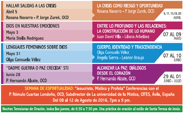 Todos los jueves a las 6:30 pm tenemos una hora de experiencia de oración de la mano de Santa Teresa de Jesús, para aprender a encontrarnos con el Señor en una relación de amistad, mediada por la oración.