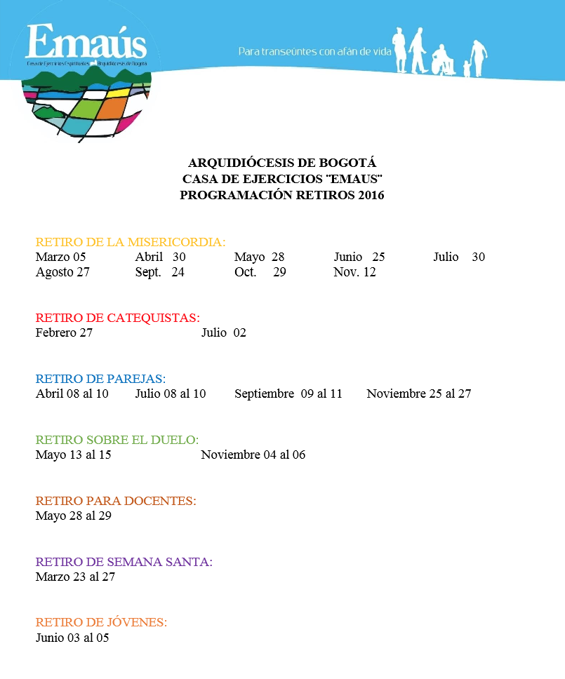 La Fundación Casa de Ejercicios Espirituales Emaús, se centra en tres ejes primordiales: Espiritualidad, Evangelización y Formación. Con una propuesta de espiritualidad para personas que tienen sed de trascendencia, en el contexto de la cultura urbana: “Espiritualidad para transeúntes con afán de vida”.
