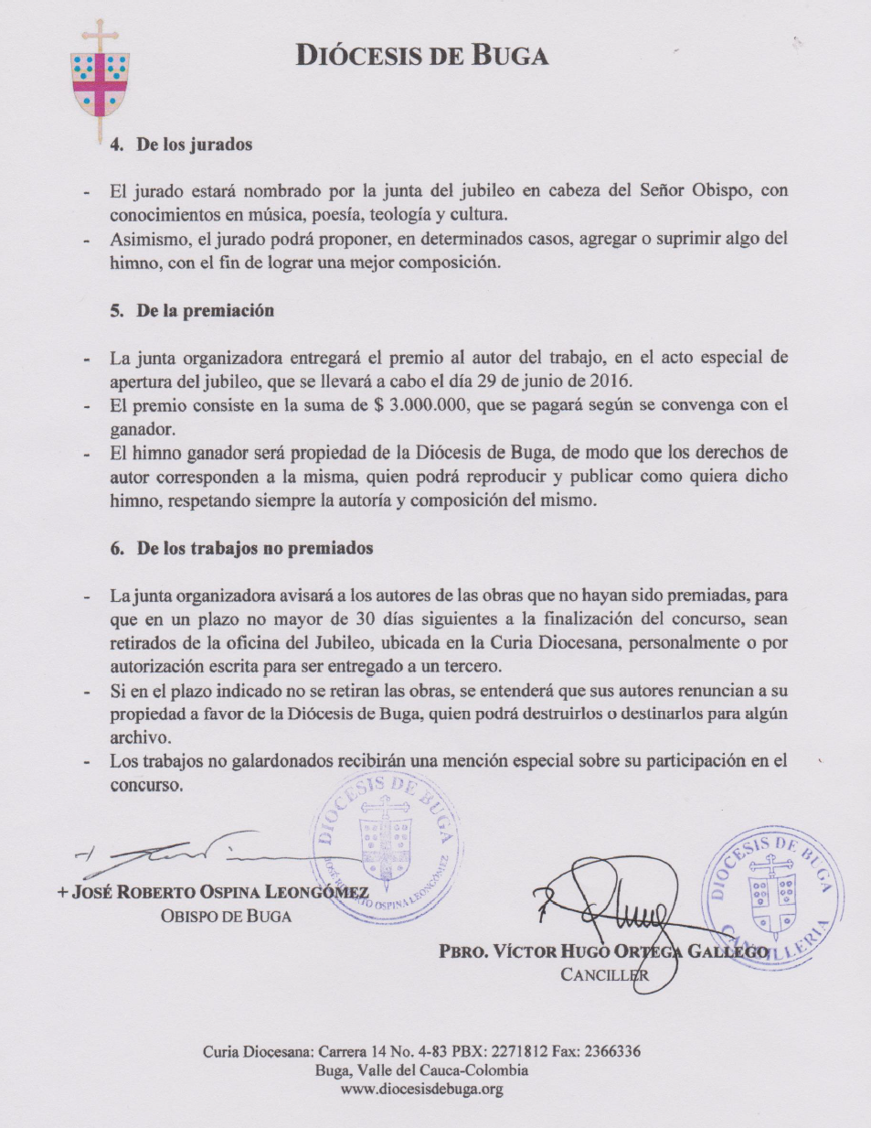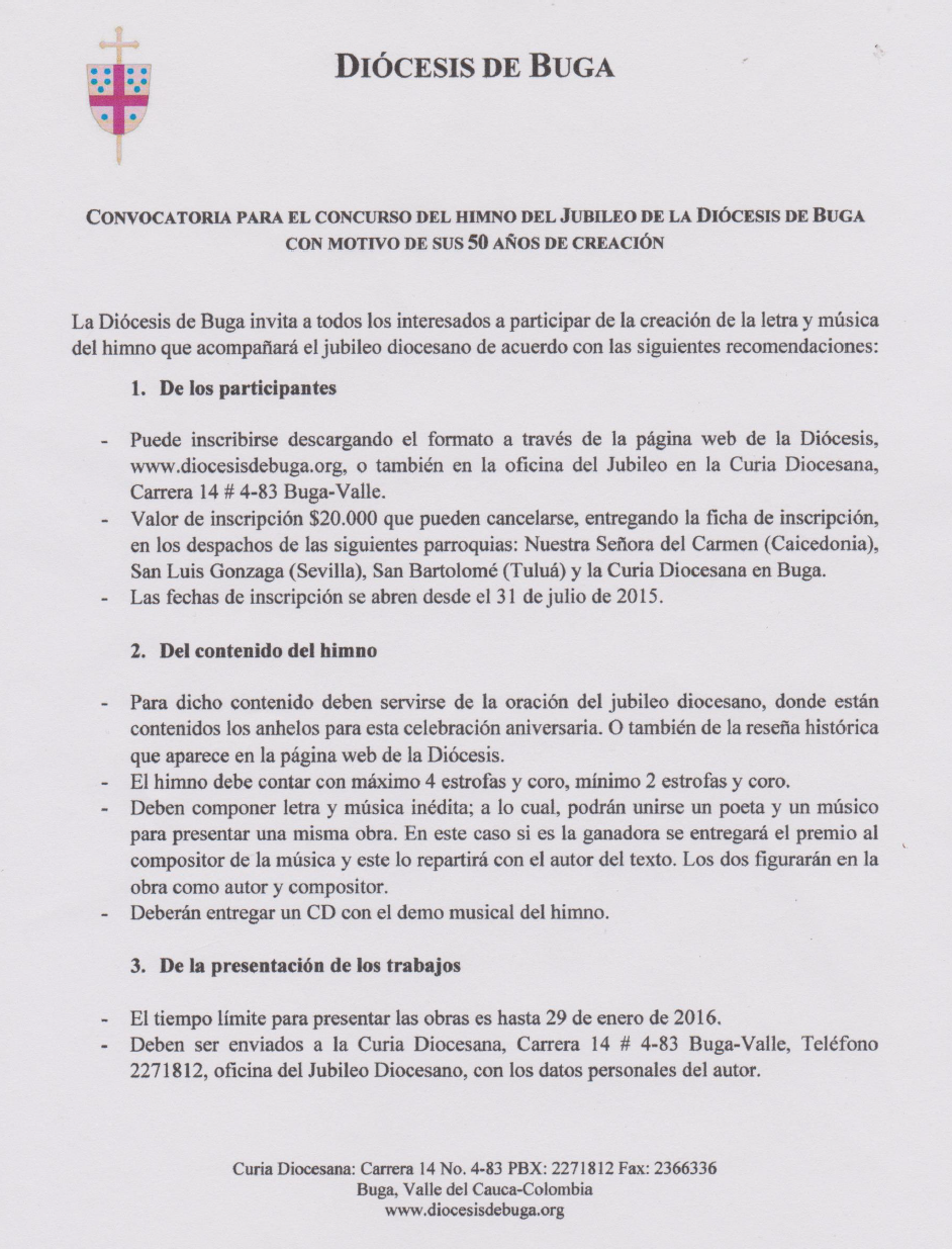 Centro de información Yo quiero Noticias Oraciones Boletines Eventos Artículos Canonización Mensajes del Señor Cardenal Cartas pastorales Homilías Mensajes La voz del pastor Documentos del Vaticano NoticiasConvocatoria para el concurso del himno del Jubileo de la Diócesis de Buga con motivo de sus 50 años de creación9 de Octubre de 2015 Like 0 Dislike 0 Noticias relacionadas Ordenaciones en la Catedral Primada de Colombia Tiempo de preparación para la Navidad Video del papa - noviembre de 2025