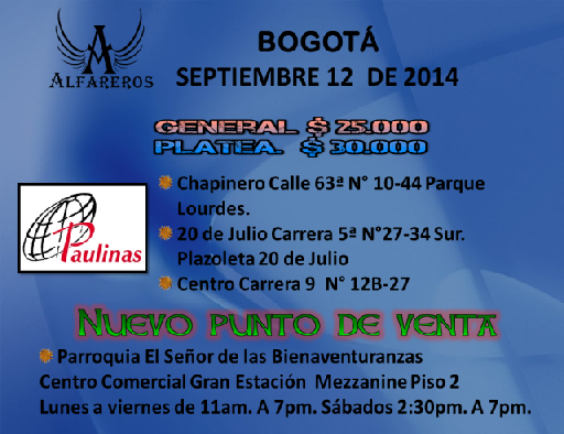 Centro de información Yo quiero Noticias Oraciones Boletines Eventos Artículos Canonización Mensajes del Señor Cardenal Cartas pastorales Homilías Mensajes La voz del pastor Documentos del Vaticano NoticiasDe Bendición en Bendición, encuentro de oración y alabanza11 de Septiembre de 2014La arquidiócesis de Bogotá. en el marco de las actividades complementarias para el Gran Giro en el plan E, tiene el agrado de invitarlos al concierto con el grupo… Mayor información: en http://www.alfareros.do/index.php?page=agenda Like 0 Dislike 0 Noticias relacionadas Ordenaciones en la Catedral Primada de Colombia Tiempo de preparación para la Navidad Video del papa - noviembre de 2025