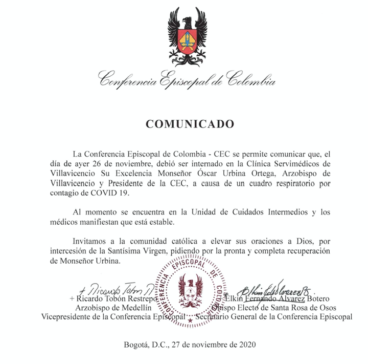 Centro de información Yo quiero Noticias Oraciones Boletines Eventos Artículos Canonización Mensajes del Señor Cardenal Cartas pastorales Homilías Mensajes La voz del pastor Documentos del Vaticano NoticiasDelicado estado de salud de monseñor Óscar Urbina27 de Noviembre de 2020 Like 0 Dislike 0 Noticias relacionadas Ordenaciones en la Catedral Primada de Colombia Tiempo de preparación para la Navidad Video del papa - noviembre de 2025