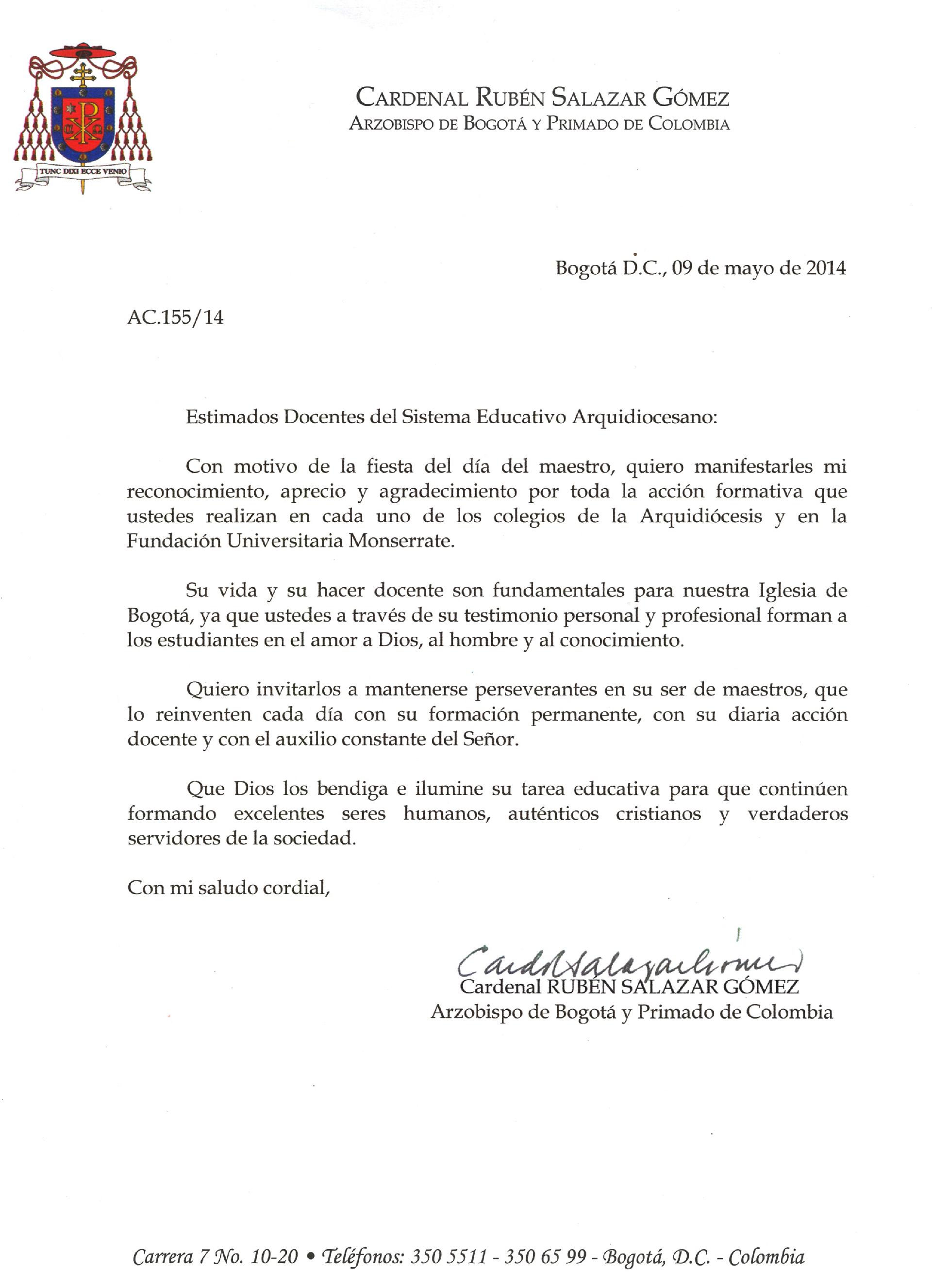 Centro de información Yo quiero Noticias Boletines Eventos Artículos Canonización Mensajes del Señor Cardenal Cartas pastorales Homilías Mensajes La voz del pastor Documentos del Vaticano Noticias¡Feliz día del Maestro!Encuentre aquí el mensaje del Señor Cardenal Rubén Salazar Gómez, Arzobispo de Bogotá.15 de Mayo de 2014. Like 0 Dislike 0 Noticias relacionadas Ordenaciones en la Catedral Primada de Colombia Tiempo de preparación para la Navidad Video del papa - noviembre de 2025