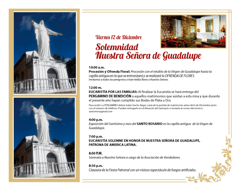 Centro de información Yo quiero Noticias Oraciones Boletines Eventos Artículos Canonización Mensajes del Señor Cardenal Cartas pastorales Homilías Mensajes La voz del pastor Documentos del Vaticano NoticiasFiesta Patronal de Nuestra Señora de Guadalupe12 de Diciembre de 2014 Like 0 Dislike 0 Noticias relacionadas Ordenaciones en la Catedral Primada de Colombia Tiempo de preparación para la Navidad Video del papa - noviembre de 2025
