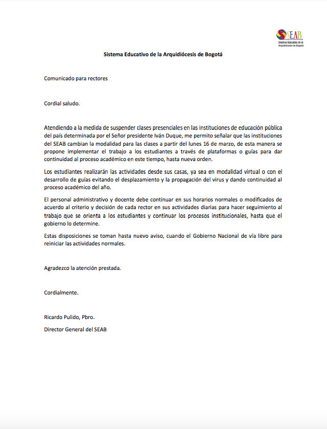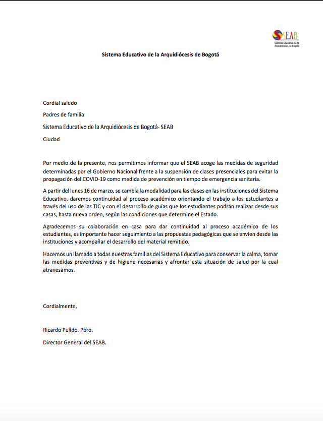 Centro de información Yo quiero Noticias Boletines Eventos Artículos Canonización Mensajes del Señor Cardenal Cartas pastorales Homilías Mensajes La voz del pastor Documentos del Vaticano NoticiasLa dirección general del SEAB informa16 de Marzo de 2020En relación con la Emergencia Sanitaria decretada por el Gobierno Nacional ante situación de salud Pública por COVID-19 el Sistema Educativo de la arquidiócesis de…Comunicado para rectores de colegios Comunicado para padres de familia Like 0 Dislike 0 Noticias relacionadas Ordenaciones en la Catedral Primada de Colombia Tiempo de preparación para la Navidad Video del papa - noviembre de 2025