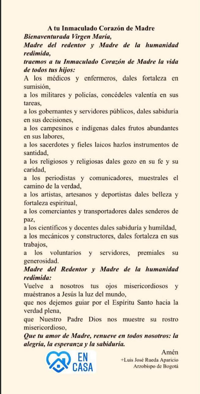 Centro de información Yo quiero Noticias Boletines Eventos Artículos Canonización Mensajes del Señor Cardenal Cartas pastorales Homilías Mensajes La voz del pastor Documentos del Vaticano NoticiasOración a María27 de Julio de 2020 Like 0 Dislike 0 Noticias relacionadas Ordenaciones en la Catedral Primada de Colombia Tiempo de preparación para la Navidad Video del papa - noviembre de 2025