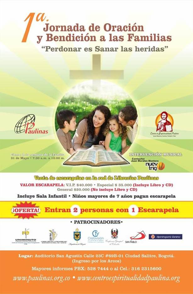El sábado 31 de mayo de 7:30 a.m. a 12:00 del día, para clausurar la Semana por la Familia, se realizará la “Primera Jornada de Oración y Bendición a las Familias” en el auditorio San Agustín, calle 23C N° 69B – 01, Ciudad Salitre, Bogotá, organizado por las Hermanas Paulinas con el apoyo de diferentes instituciones, entre ellas la Conferencia Episcopal de Colombia, el CELAM, la Arquidiócesis de Bogotá, UNIMINUTO, Cristovisión y San Pablo.