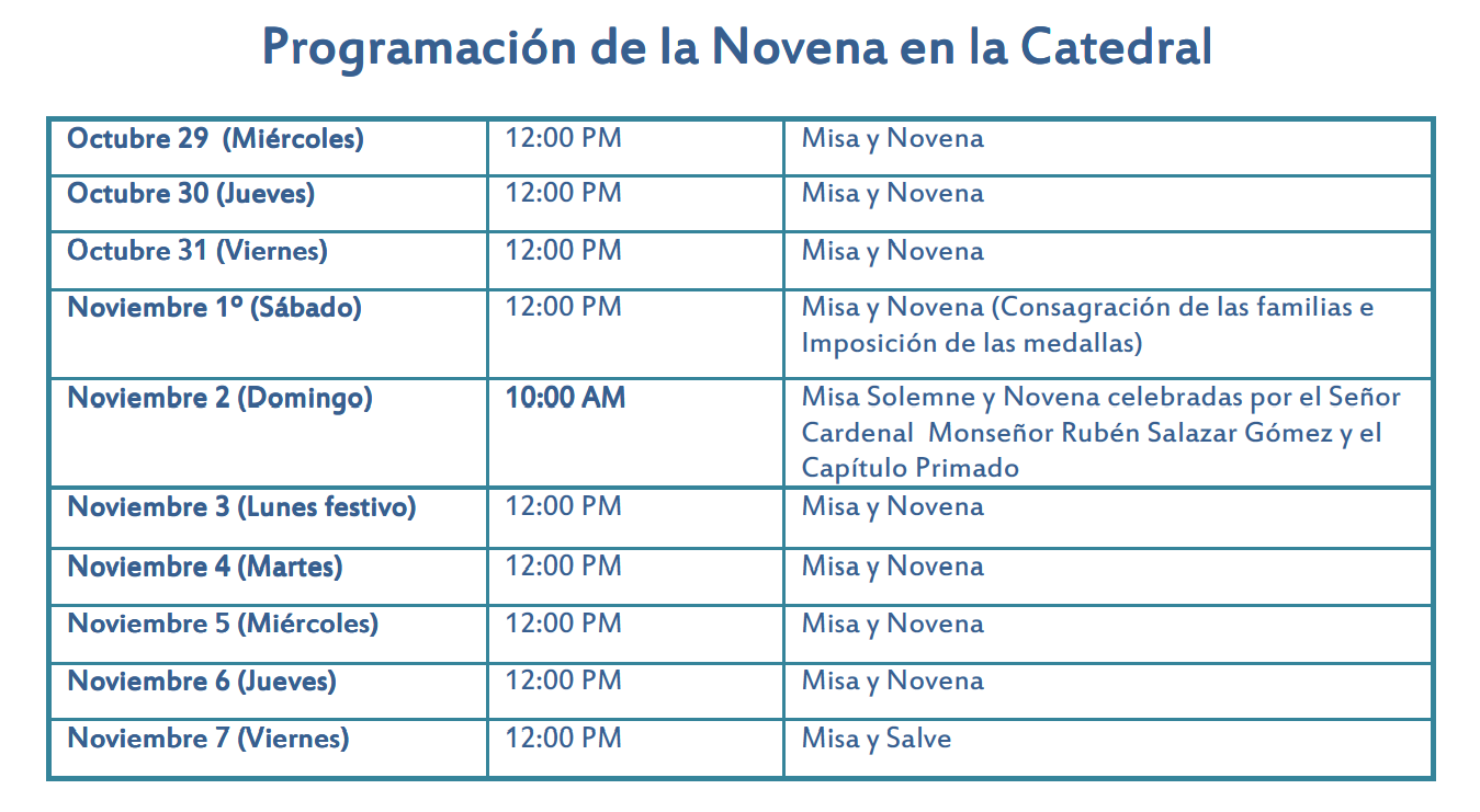 Centro de información Yo quiero Noticias Oraciones Boletines Eventos Artículos Canonización Mensajes del Señor Cardenal Cartas pastorales Homilías Mensajes La voz del pastor Documentos del Vaticano NoticiasProgramación de la novena a Nuestra Señora del Topo en la catedral primada de Colombia31 de Octubre de 2014Te invitamos a ver nuestro articulo sobre la Cofradía de Nuestra Señora del Topo Like 0 Dislike 0 Noticias relacionadas Ordenaciones en la Catedral Primada de Colombia Tiempo de preparación para la Navidad Video del papa - noviembre de 2025