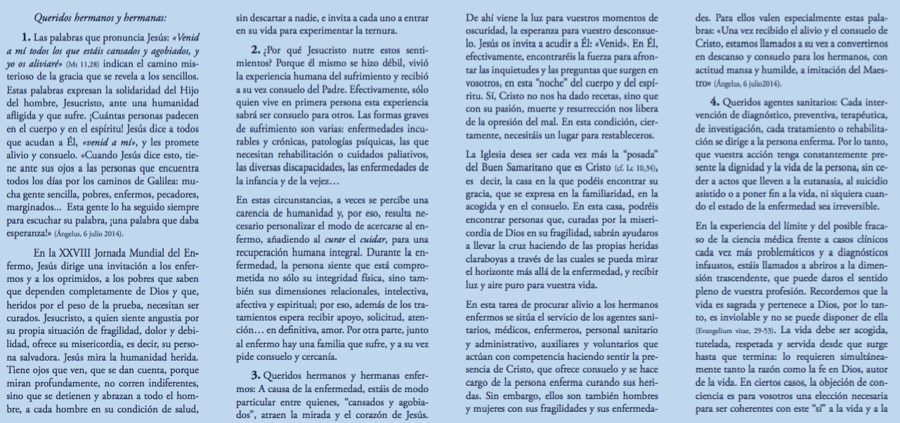 Centro de información Yo quiero Noticias Boletines Eventos Artículos Canonización Mensajes del Señor Cardenal Cartas pastorales Homilías Mensajes La voz del pastor Documentos del Vaticano NoticiasXXVIII Jornada mundial del enfermo, mensaje del Santo Padre Francisco11 de Febrero de 2020 Like 0 Dislike 0 Noticias relacionadas Ordenaciones en la Catedral Primada de Colombia Tiempo de preparación para la Navidad Video del papa - noviembre de 2025